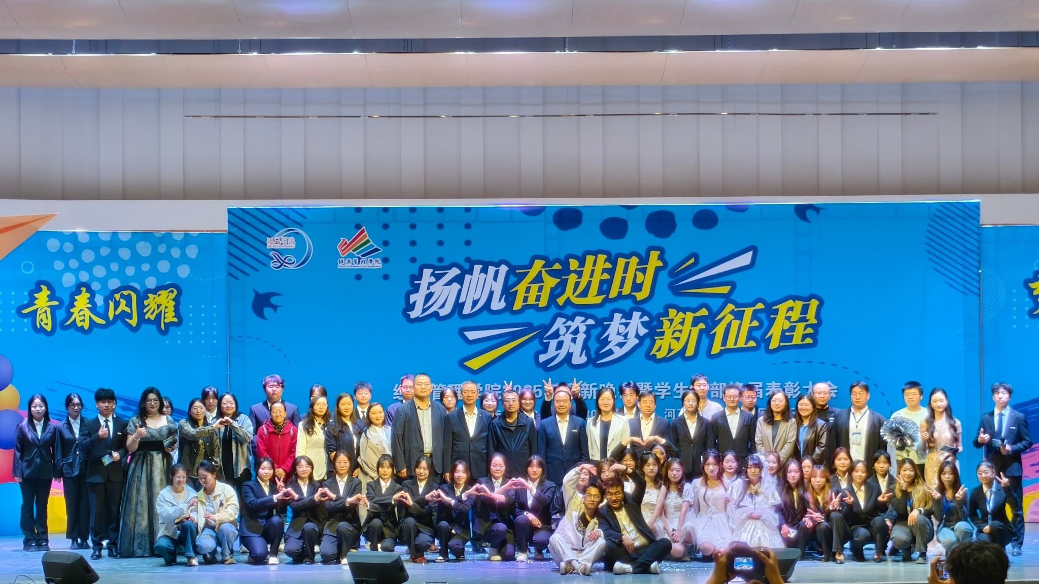 演出结束后,全体参会人员合影留念,在工作人员的引领下大家有序离场,本次迎新晚会暨学生干部换届表彰大会圆满落幕。此次活动不仅消除了新生的陌生感,增强了其对学院的归属感,更以“传承”与“活力”为关键词,为2025级新生的大学生活写下了精彩开篇。未来,愿经管学子们带着这份温暖与力量,在新征程上扬帆起航,书写属于自己的精彩篇章!